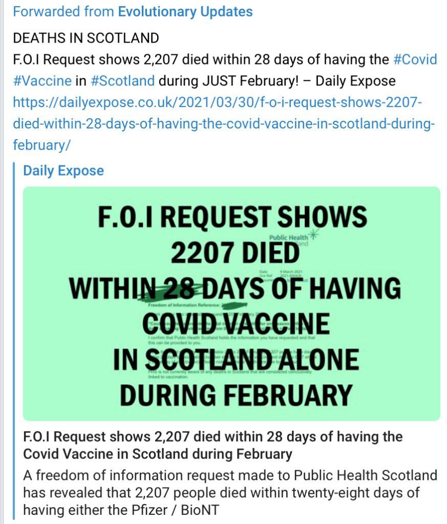 2207 Covid Vaccine related deaths within 28 days in Scotland alone. Significant increase in deaths after vaccine in US 2021.