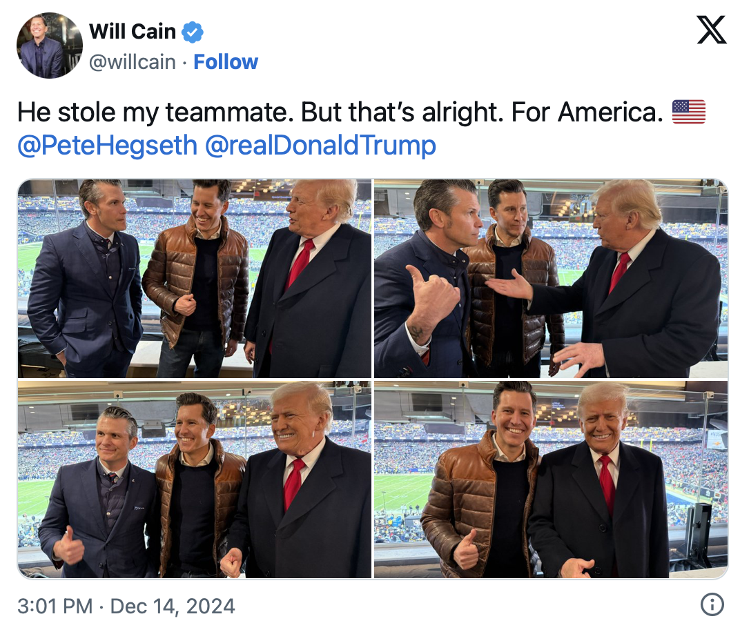 “Hegseth, Trump’s pick for Defense Secretary, alongside DeSantis further fueled speculation about Trump’s political aspirations and influence over the GOP. Hegseth, a former Army major, brings credibility and military expertise to Trump’s circle, strengthening his appeal to military supporters.