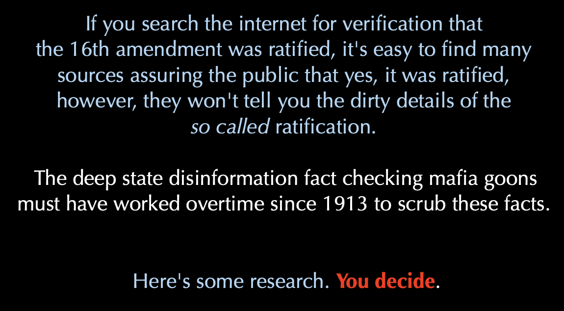 Benson also asserted, as an example of a state’s violation of its own Constitution, laws, or procedural rules, the claim that the Tennessee State Constitution prohibited the legislature from acting on any proposed amendment to the U.S. Constitution submitted by Congress until AFTER the next state legislative elections. According to Benson, the Tennessee legislature acted on the proposed 16th amendment the same month it was received, prior to any new state legislative elections. That’s not Lawful.