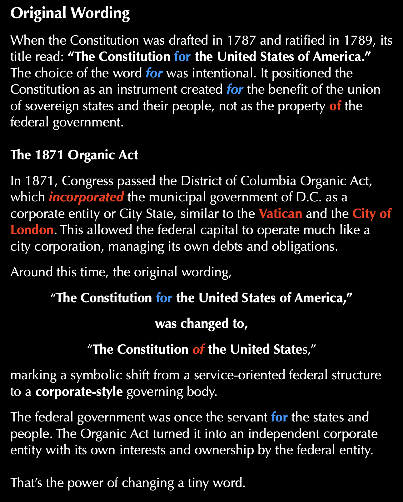 The aftermath of the Organic Act of 1871, illustrates how changing wording, punctuation, capitalization, and pluralization can alter the context and meaning of the document completely.