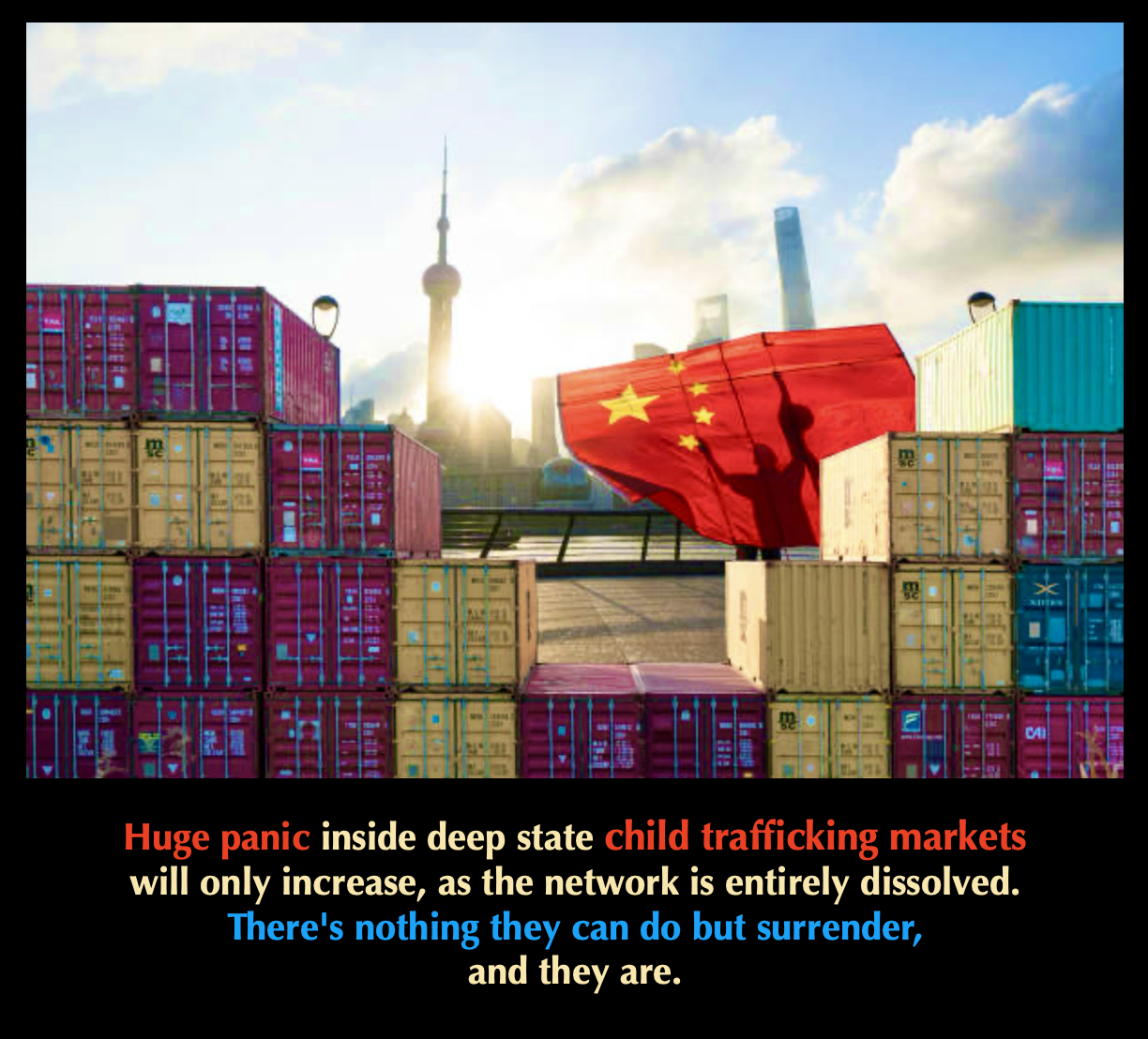 EVERYTHING is being tracked with Higher Technology. This is seriously impacting China’s child trafficking trade. The ships loaded in China are not moving out of ports, and the illegal cargo gates are open. Thousands of slaves are being released, flooding the ports and streets of China with people taking a miraculous breath of freedom.