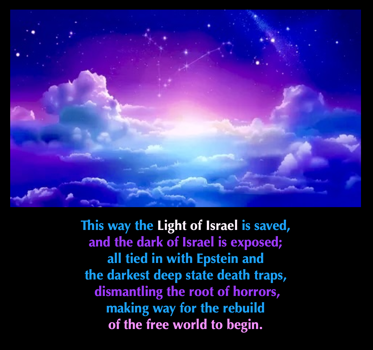 Remember, President Trump cannot go after Israel. He’s the anchor keeping everything truly sacred there alive by siding with Israel. Otherwise, all the big countries surrounding Israel would bomb it to smithereens. As long as Trump sides with Israel, Israel is safe and we need to keep the innocent Light within Israel safe.