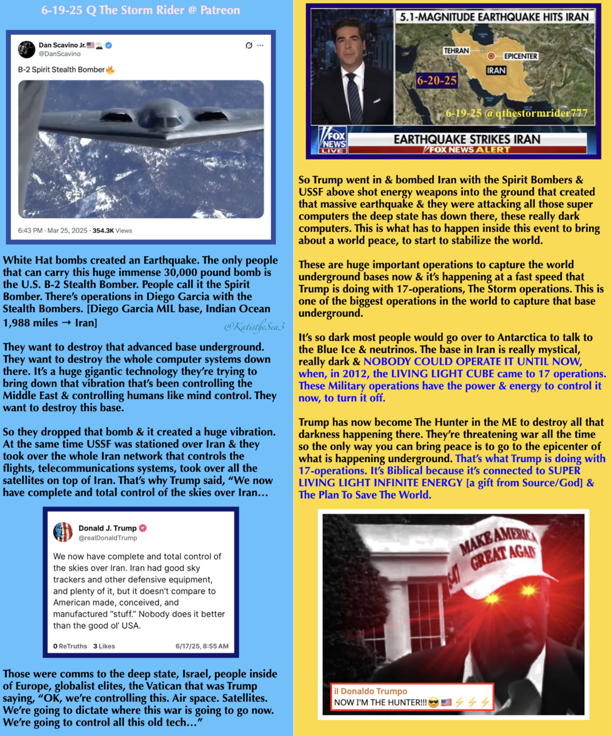 A U.S. B-2 Stealth Bomber was deployed to destroy those diabolical systems, to stabilize the frequencies and bring in world peace, all in collaboration with the United States Space Force. The devil generating machines have now been turned off, freeing the Middle Eastern People and the world from darkness, thanks to President Trump, 17 operations, USSF and SOURCE.