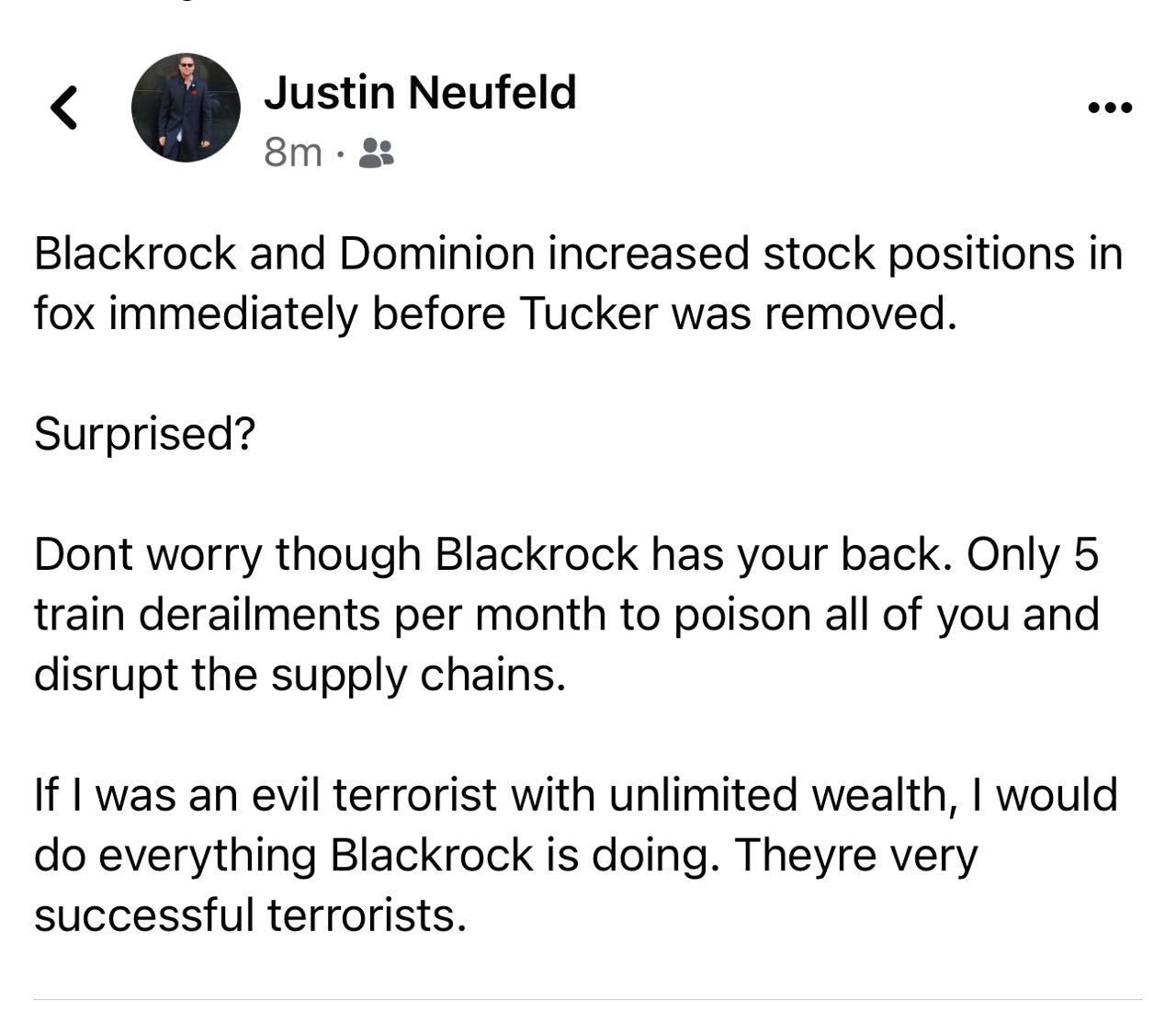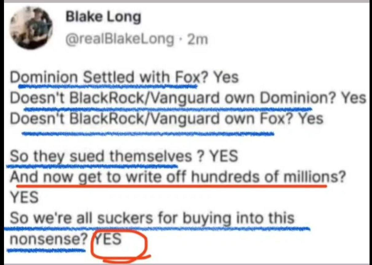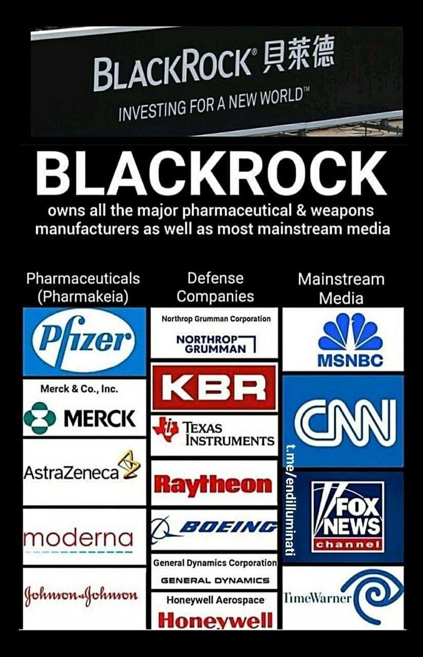 What does Big Pharma, Main Stream Media, The Political System, The Education System, The Entertainment Industry, Communication Systems, Transportation Industry, Social Media Companies, Weapons Manufacturers, The Public Water Systems, The Financial System and Science Infused Agriculture have in common? Vanguard and BlackRock. These groups move the world population through influence every step of the way…as long as we follow.
