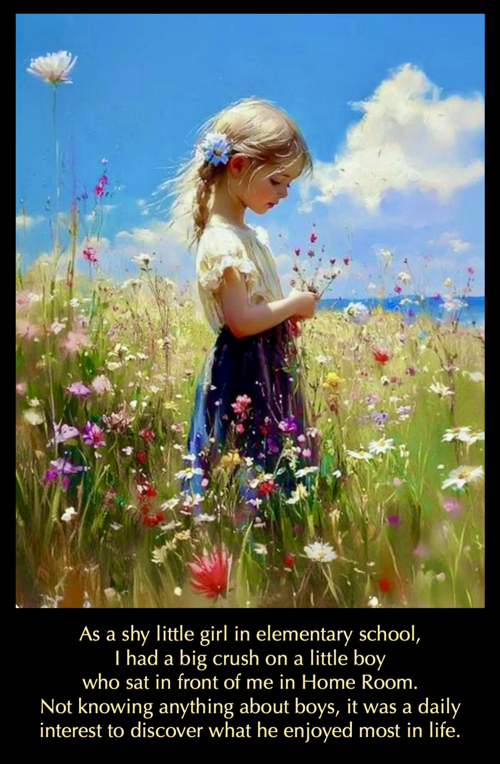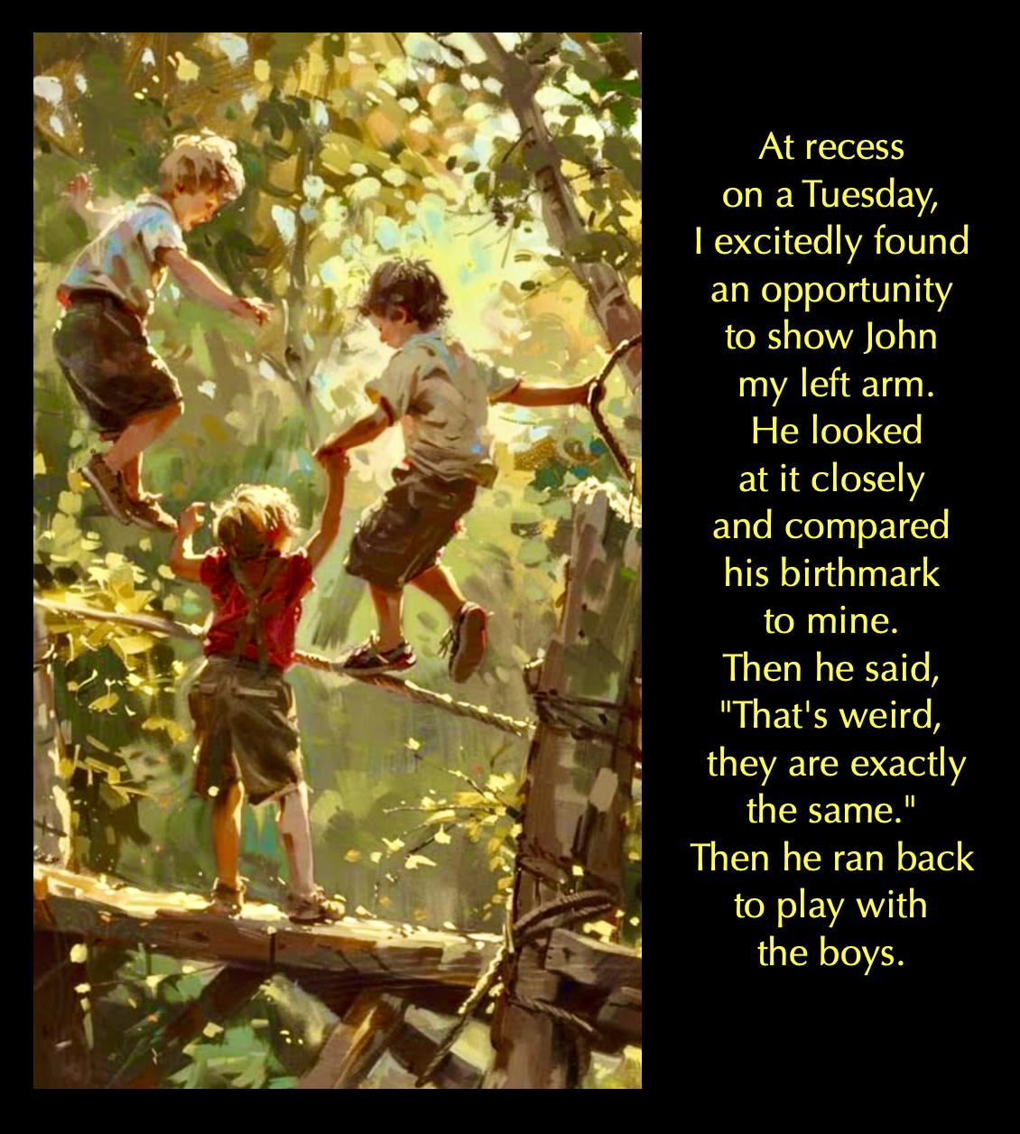 His name was John and he had a very distinct birthmark on his upper left arm, which I observed daily sitting right behind him. It occurred to me during an arithmetic lesson, that if I had the same birthmark in the very same place on my left arm, I could show him and we would have something to talk about. Every day for an entire week I imagined that same birthmark in the exact same place on my left arm. It never occurred to me this wouldn’t work. I was certain it would.