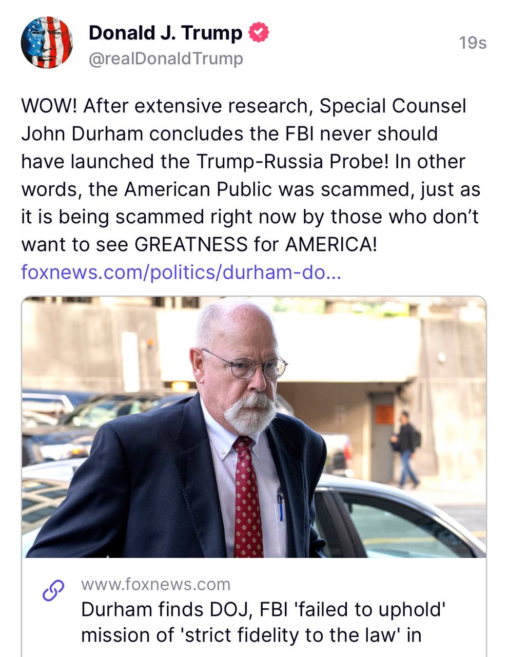 DURHAM> COMES INTO THE PICTURE STRONG AND REPUBLICANS WILL USE HIS INTEL IN EVERY WAY POSSIBLE IN THE NEXT MONTHS TO EXPOSE A CORRUPT GOVERNMENT AT ALL LEVELS.