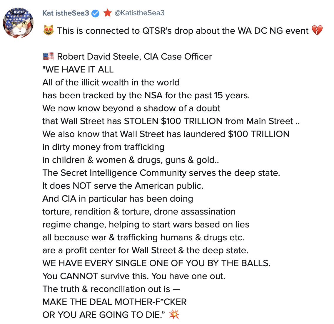 Q) The Storm Rider recently mentioned how important White Hat CIA Spy, Robert David Steele has been to this TRUTH MOVEMENT! He had balls of Steele, and he was telling the people how far the White Hat’s have come way back in 2021.