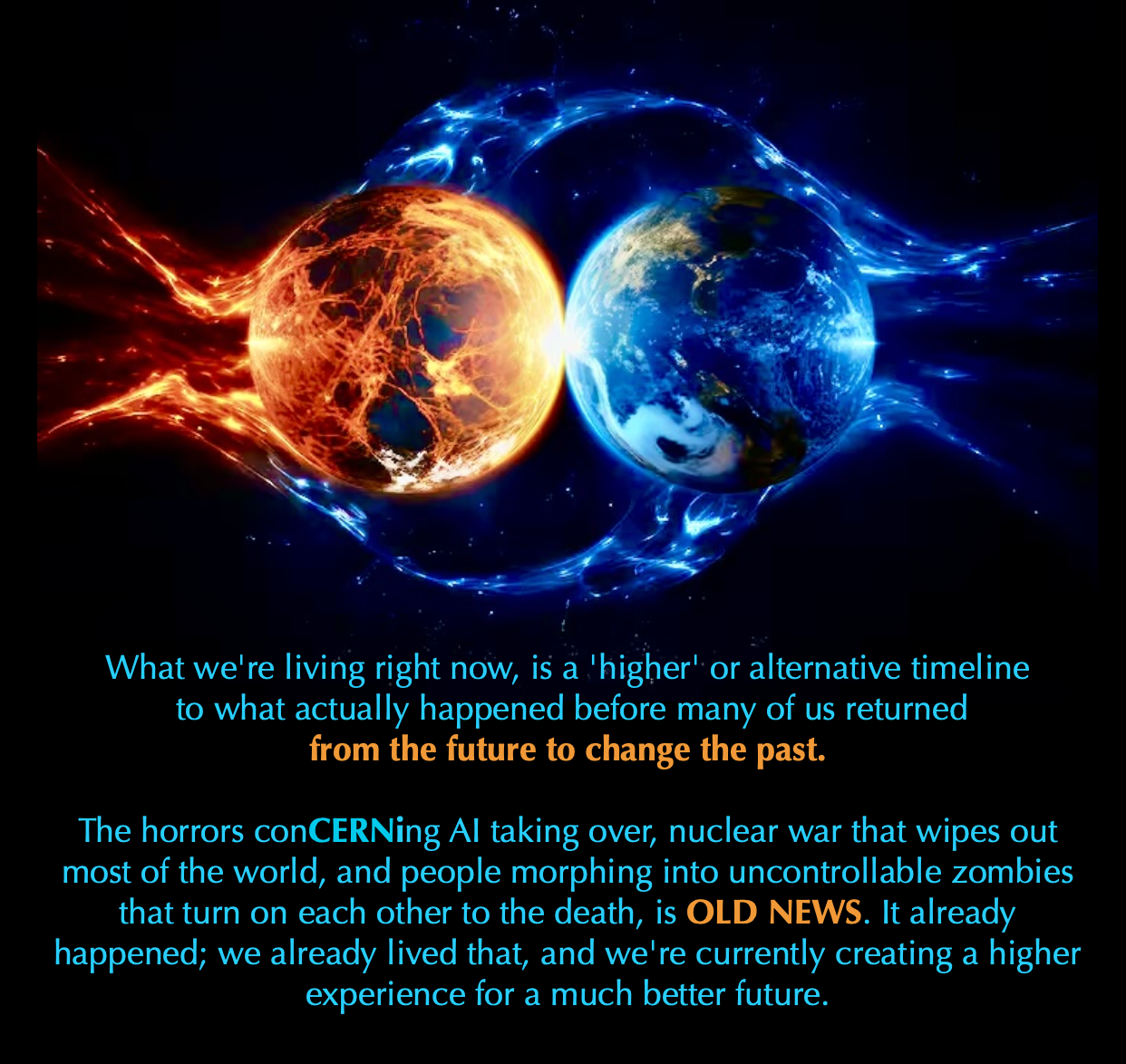 The only thing the Creation Light Ship will not thwart, is the consciousness of humanity itself. If humans become paranoid and begin to add to the fear porn, those timelines will be created by humanity. That’s how it works. The aliens gave us a mind to push our mental energy in the direction they desire. They want us to use our mental energy to rev up fear, anger, hate and revenge, taking us to the dark side, where we create our own death spiral… or we can create those higher realities of peace and prosperity from the eternal harmony within.