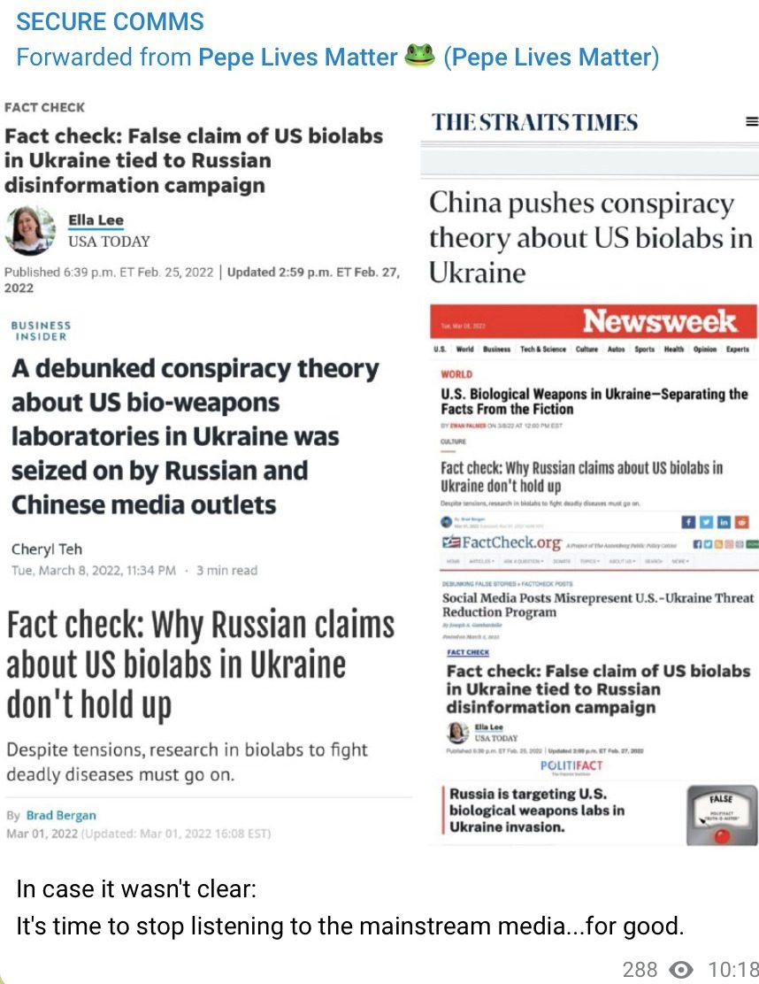 Fact checkers at USA Today, NEWSWEEK, THE STRAITS TIMES, POLITIFACT…and many more debunk conspiracy theory about US Bio-weapon labs in Ukraine.