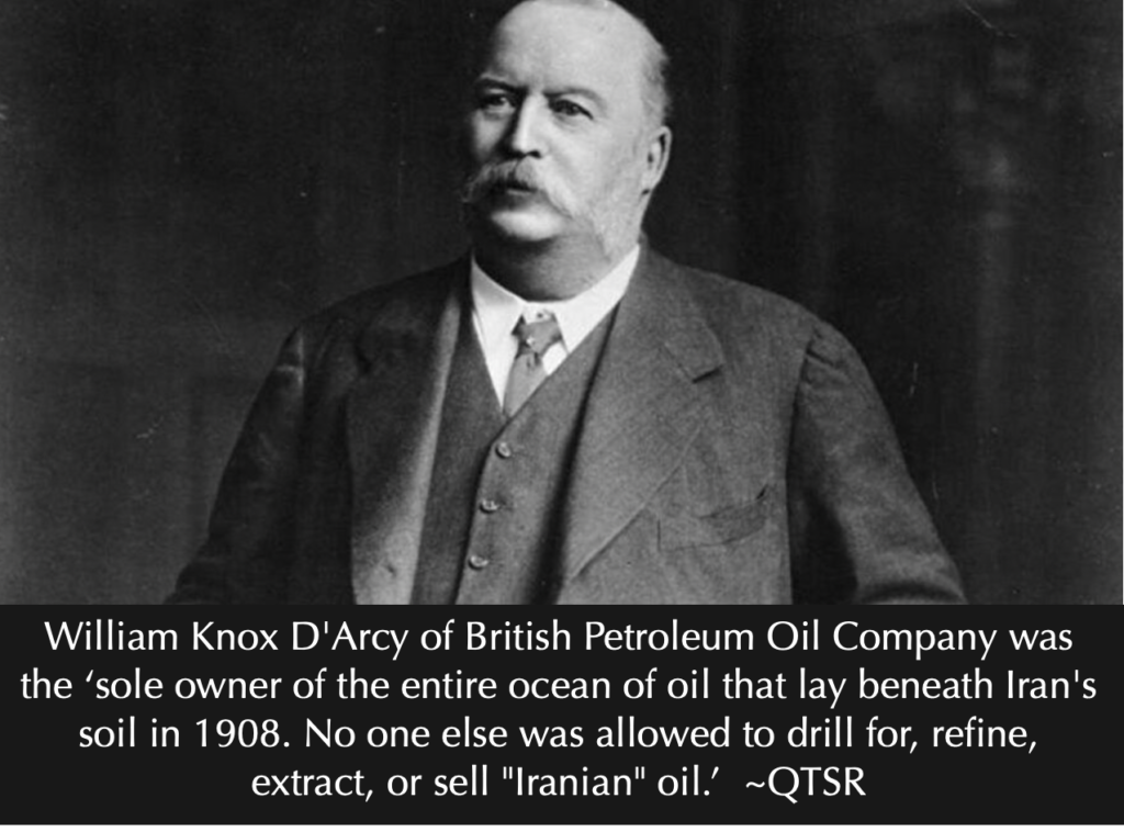 Under this contract, which he designed, D’Arcy was to own whatever oil he found in Iran and pay the government just 16% of any profits he made — never allowing any Iranian to review his accounting. After his first strike in 1908, he became sole owner of the entire ocean of oil that lies beneath Iran’s soil. No one else was allowed to drill for, refine, extract, or sell “Iranian” oil.