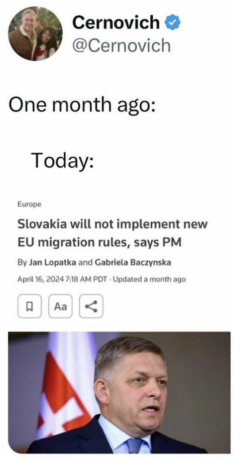 ROBERT FICO says no to unvetted migrants. Does not buckle under pressure. He says no to WHO pandemic treaty and does not buckle under significant pressure. He stands for the people and his Republic and fights harder for their rights.