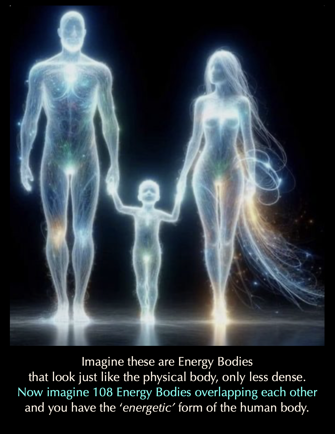 Currently, we have 108 energy bodies that make up what we experience as a physical flesh and blood body, which is an illusion. The experience is real, the solidity is not. Change your frequency and your body transforms, just like a snowflake.