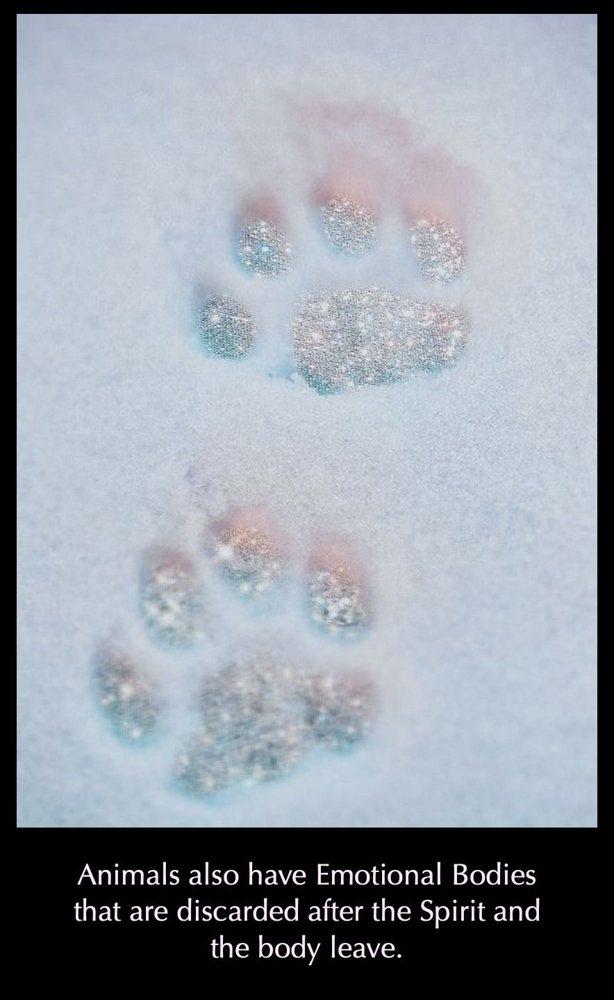 Many people see paw imprints in the carpet, on the bed, in the snow etc., after their pet has passed over. They may hear them walking, purring, barking, drinking water or eating, because the Emotional Energy Body has a physical presence. The actual Spirit of pets and people tend to leave after a few days or sooner, but the Emotional Energy Body of the dead can live on this plane as long as life exists on this planet. They often exhibit the same behavior as the person or animal the Emotional Body came from.