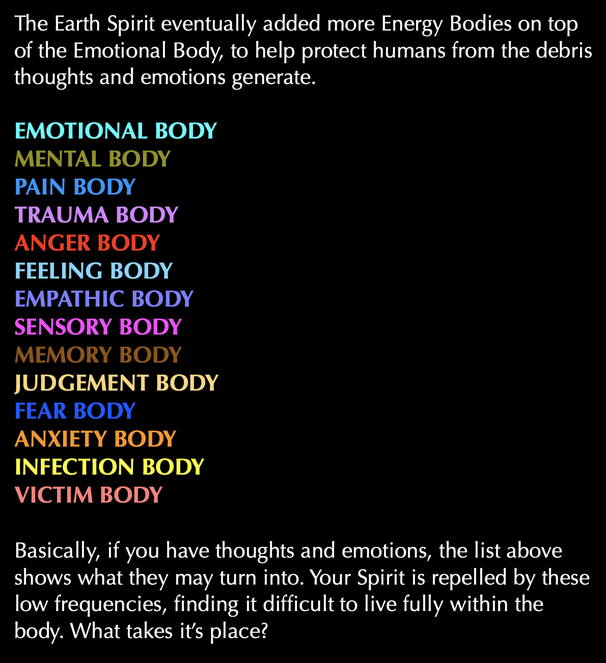 To support the human body on this earth plane, the Earth Spirit took aspects of its own Spirit; its own energy field, and blanketed each living being with energy buffers to capture the debris from mental and emotional rubbish, adding an Emotional Body ‘Sponge’ in the form of an additional Energy Body to each being. This buffer would collect the debris from Emotions, keeping it away from contaminating the rest of the Pure Light, High Frequency Energy Bodies.