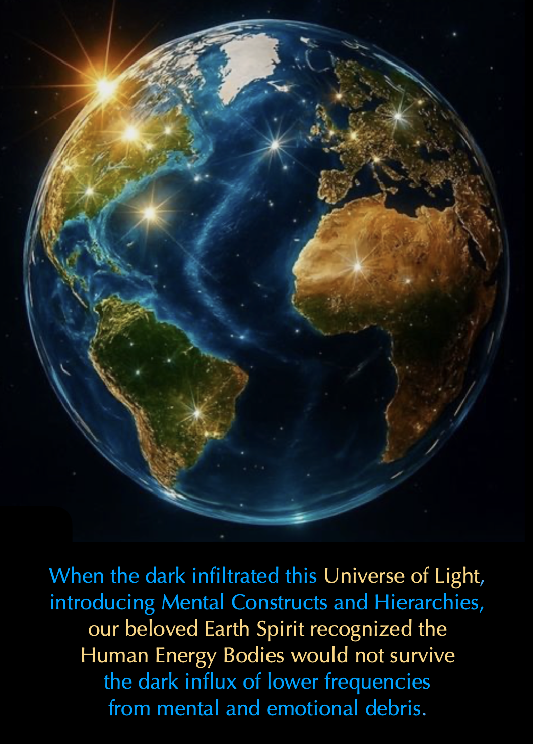 As the dark attacks on the Earth Spirit increased to debilitating levels, the Earth Spirit was unable to keep up with the clearings and survive itself. Soon, the Emotional Energy Body Buffers around living beings, began overflowing with toxic dark waste, bleeding into our Pure Light Energy Bodies; which we experience as a physical body. This is the main cause of all illness, pain and death on earth today.