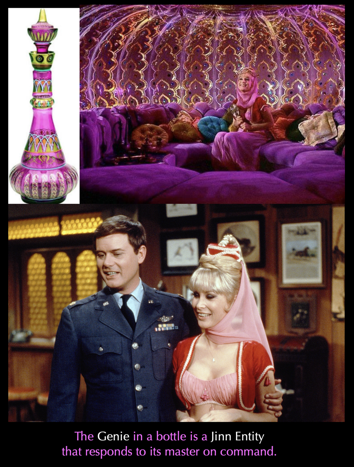The television series,”I Dream of Jeannie,” was a fantasy sitcom based around the Jinn Entity. In the show, an astronaut played by Larry Hagman, finds a Jinn or Genie in a bottle on the beach and has his wishes granted. He sets the Genie free, but she tricks him by hiding in his duffle bags so he’ll bring her home. The Genie (Jinn) displayed very powerful manipulative and persuasive energy, outsmarting her “master,’ regularly.