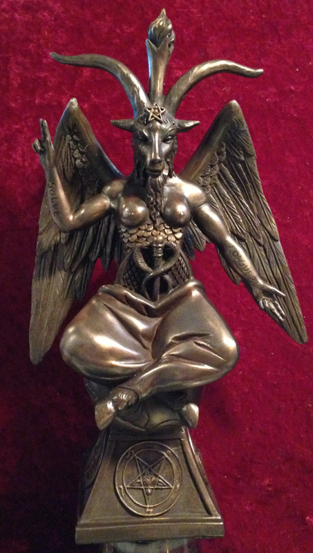 The Baphomet is a hermaphroditic winged human figure with the breasts of a woman on a male body with a goats head. (GOAT = GOD OF ALL THINGS in Satanism) The Satanic Temple commissioned a statue of Baphomet, which was unveiled in 2015 and then moved to various places as a protest against Christianity.